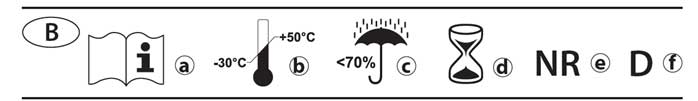 B VÝZNAM PIKTOGRAMOV / SYMBOLOV: a Overte v užívateľskej príručke. b Rozsah teplôt skladovania. c Maximálna úroveň relatívnej vlhkosti pri skladovaní. d Lehota použiteľnosti: uvedený na výrobku. e NR: táto maska sa môže používať maximálne jednu zmenu (maximálne 8 hodín). Jednorazový výrobok, nesmie sa používa viackrát. f D: táto maska úspešne prešla nepovinnými skúškami upchávania dolomitovým prachom pre slobodnejšie a komfortnejšie dýchanie. EXP doba expirácie výrobku pri správnom skladovaní.